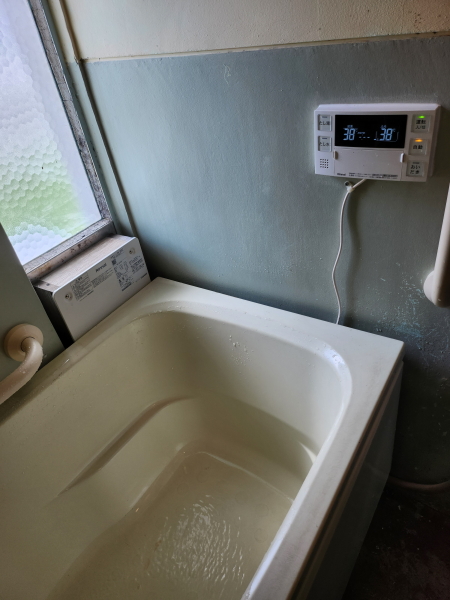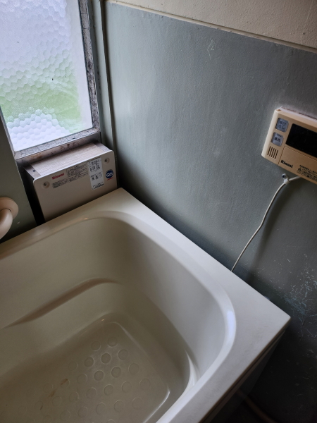 施工前:約14年使用の壁貫通型給湯器 自動湯張りをすると水位が一定しない。