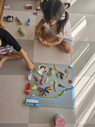 先日作った粘土のジオラマ幕張パーキングを引っ張り出し遊びだした二人!