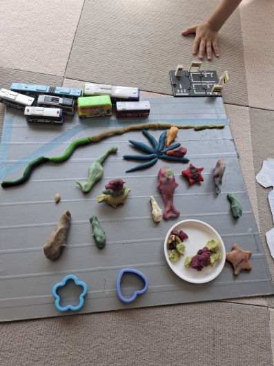 公園で見た、鯉や亀を作ってとリクエストがあり、せっせと作り始めると、孫もウミヘビやイソギンチャク だと言いながら作り始めました。