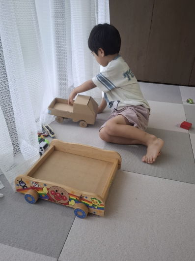 積み木にトミカにダンボール3号車と・・・積み木を入れる木箱は今度はフェリーだそうです!