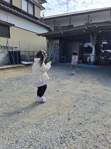 シャボン玉を手に駆けずり回る孫二人!