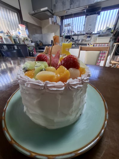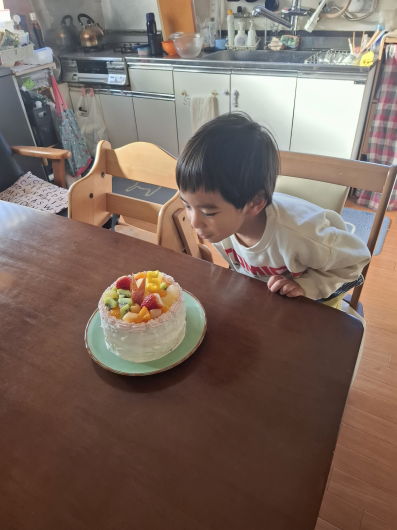 仕事から帰ってくると、昨日から泊まりに来ていた孫が、ローカのサッシを開け「ママがケーキを作ってくれて、僕も手伝ったよ(^^)/ 3時のおやつに一緒に食べよう!」と大声で教えてくれました(#^^#)