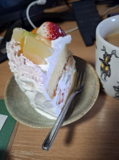 凄いボリュームですが、食べてみると、スポンジケーキは軽く、クリームはしつこい甘さで無く、果物もほんのり甘い程度で食べやすく、美味しかったですよ(^^♪